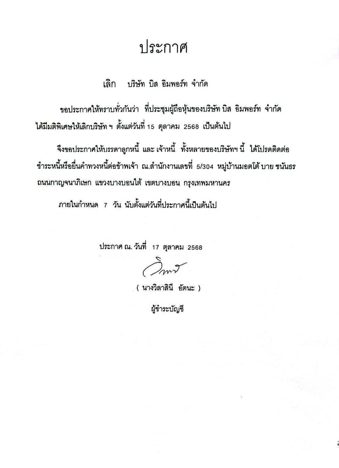 ประกาศ เรื่อง ประกาศเลิกบริษัทจำกัด