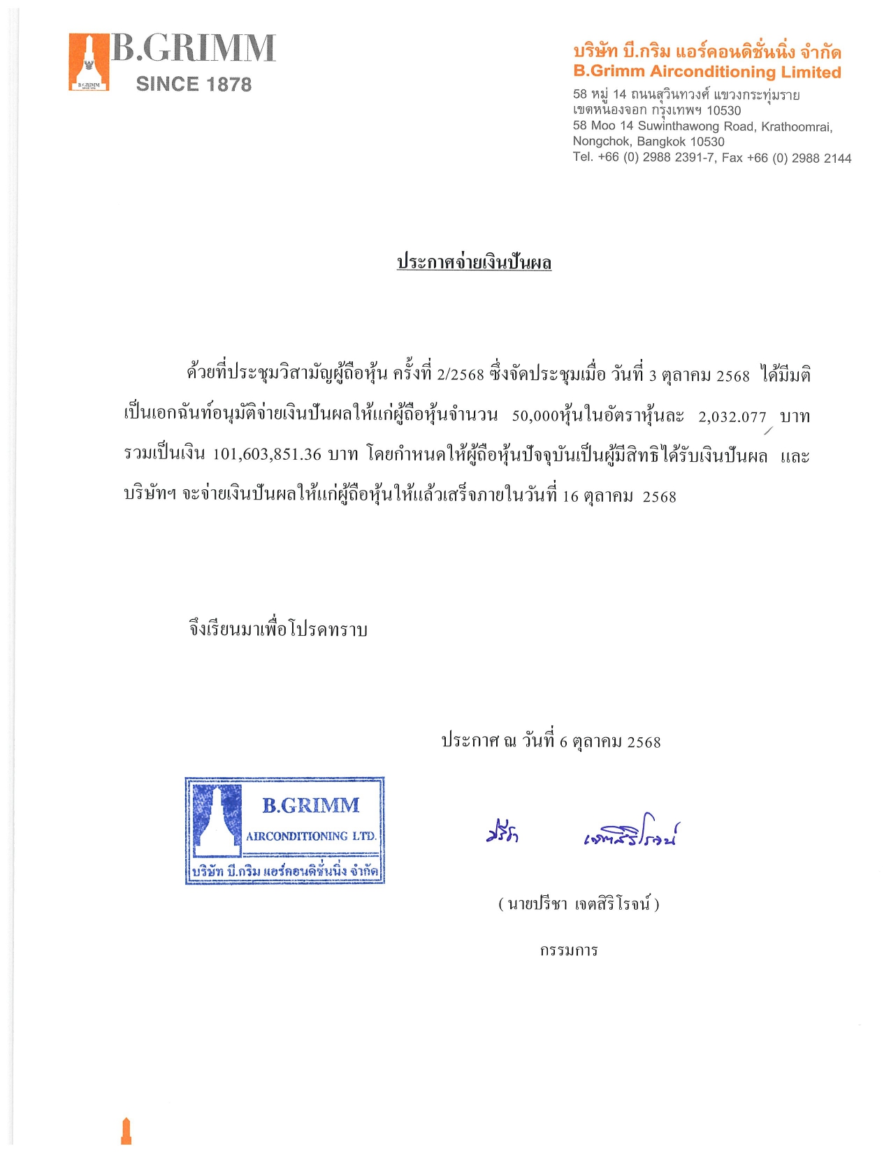 ประกาศ เรื่อง ประกาศจ่ายเงินปันผล