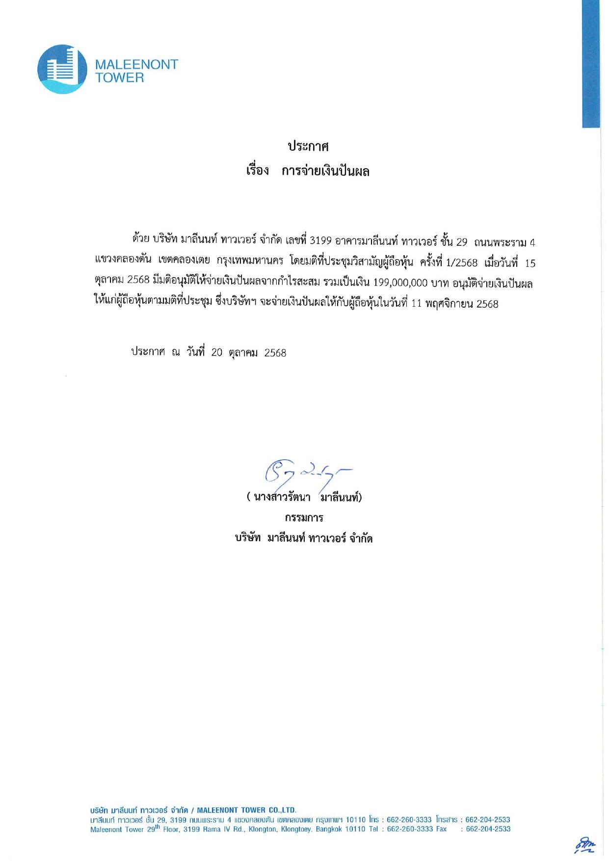 ประกาศ เรื่อง ประกาศจ่ายเงินปันผล