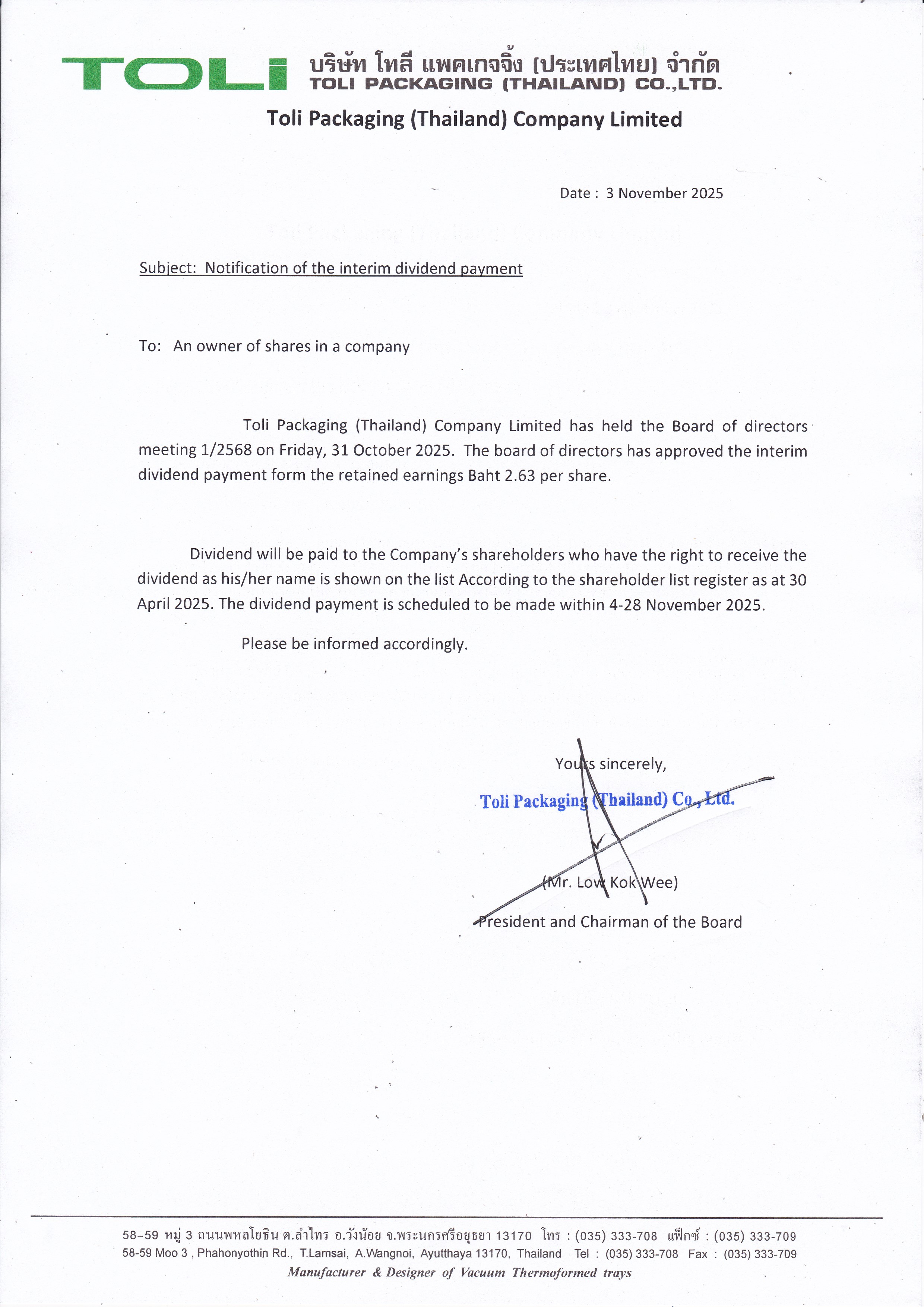 ประกาศ เรื่อง ประกาศจ่ายเงินปันผล