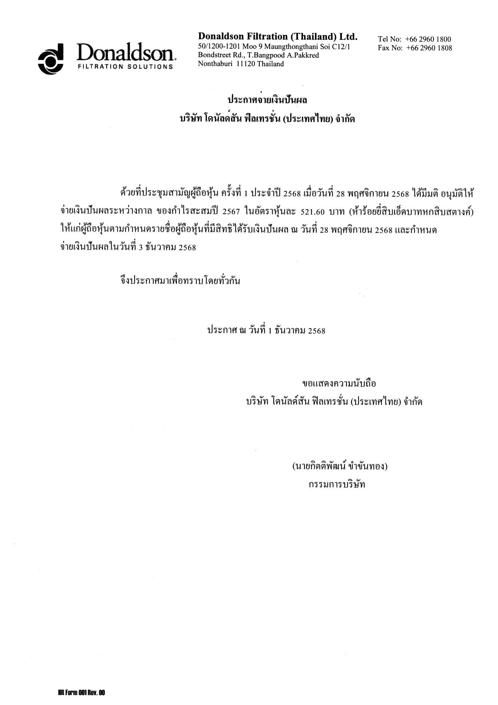 ประกาศ เรื่อง ประกาศจ่ายเงินปันผล