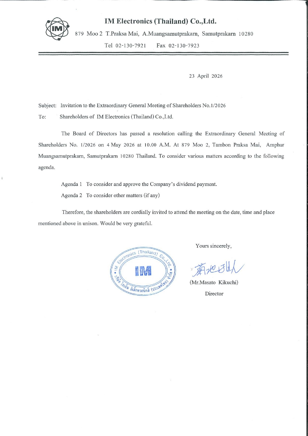 ประกาศ เรื่อง ประชุมวิสามัญ จ่ายเงินปันผล