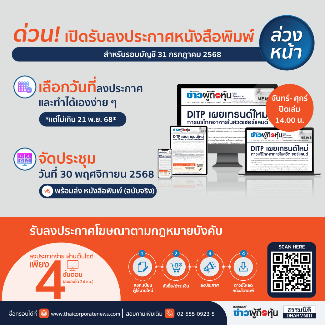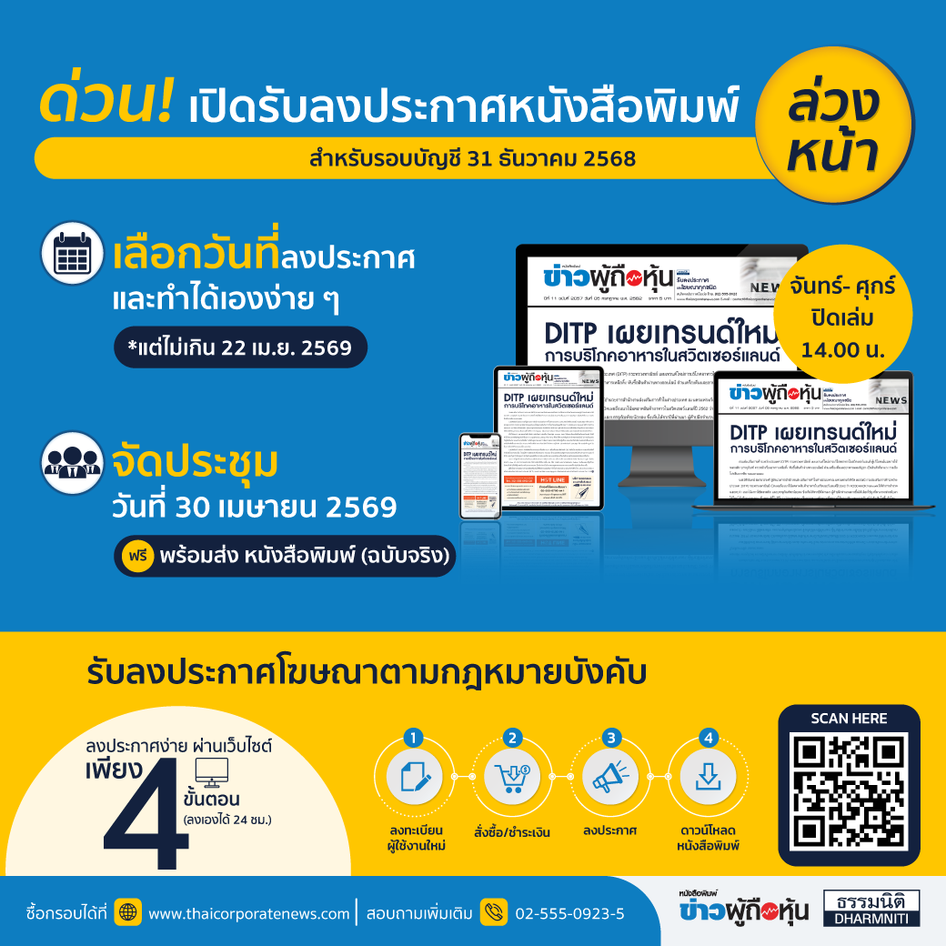 ลงประกาศหนังสือพิมพ์ 1 ครั้ง ก่อนวันจัดประชุมไม่น้อยกว่า 14 วัน