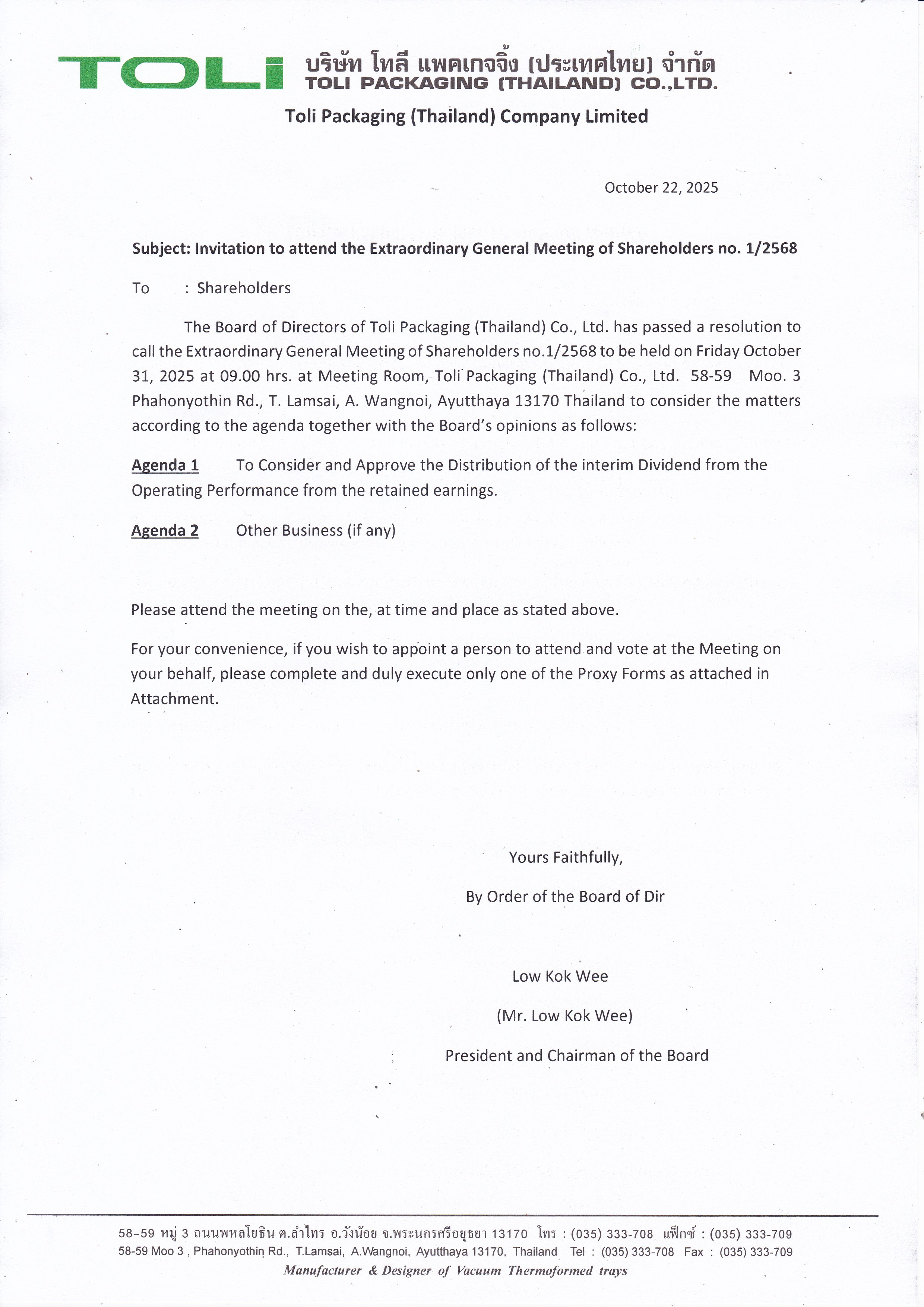 ประกาศ เรื่อง ประชุมวิสามัญ จ่ายเงินปันผล