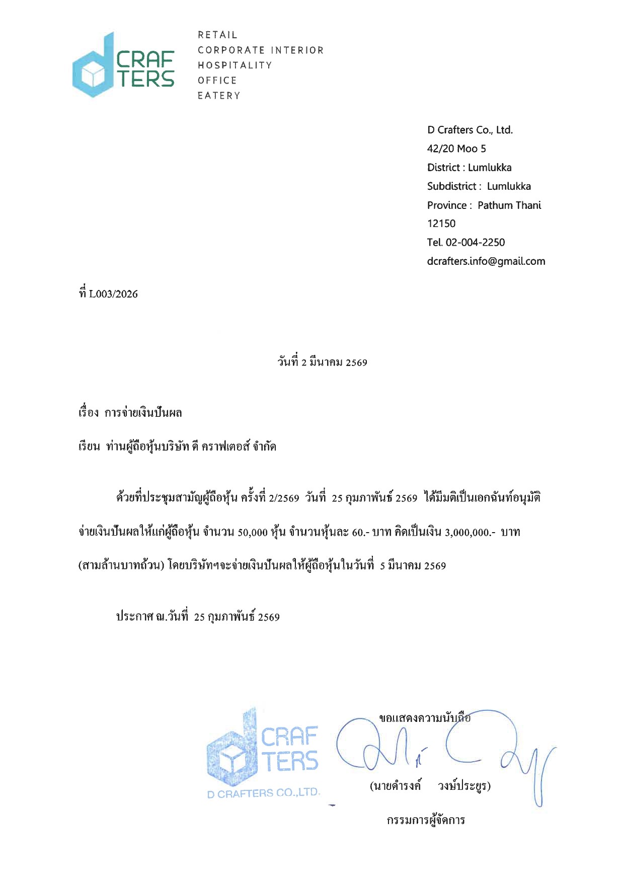 ประกาศ เรื่อง ประกาศจ่ายเงินปันผล
