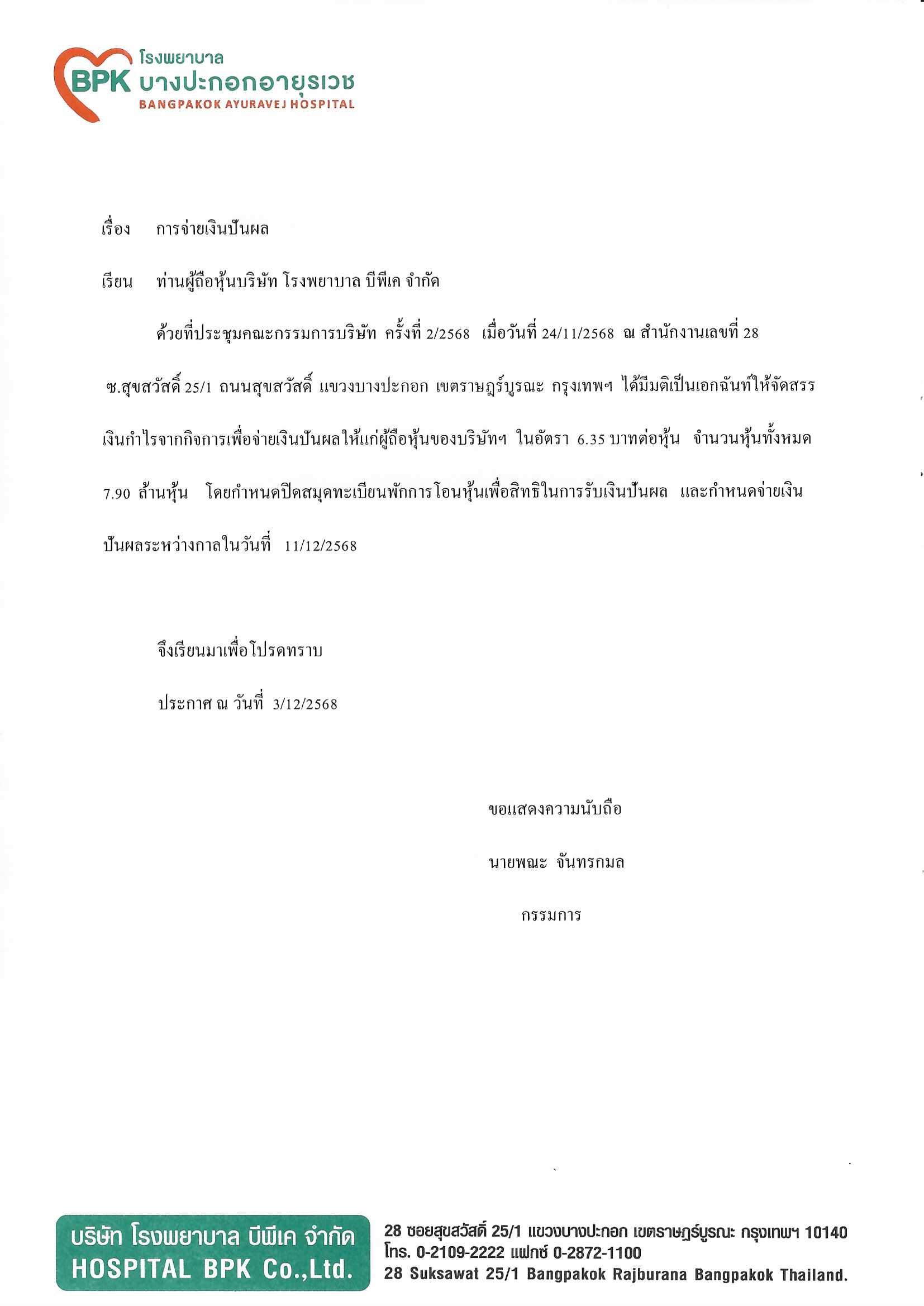 ประกาศ เรื่อง ประกาศจ่ายเงินปันผล