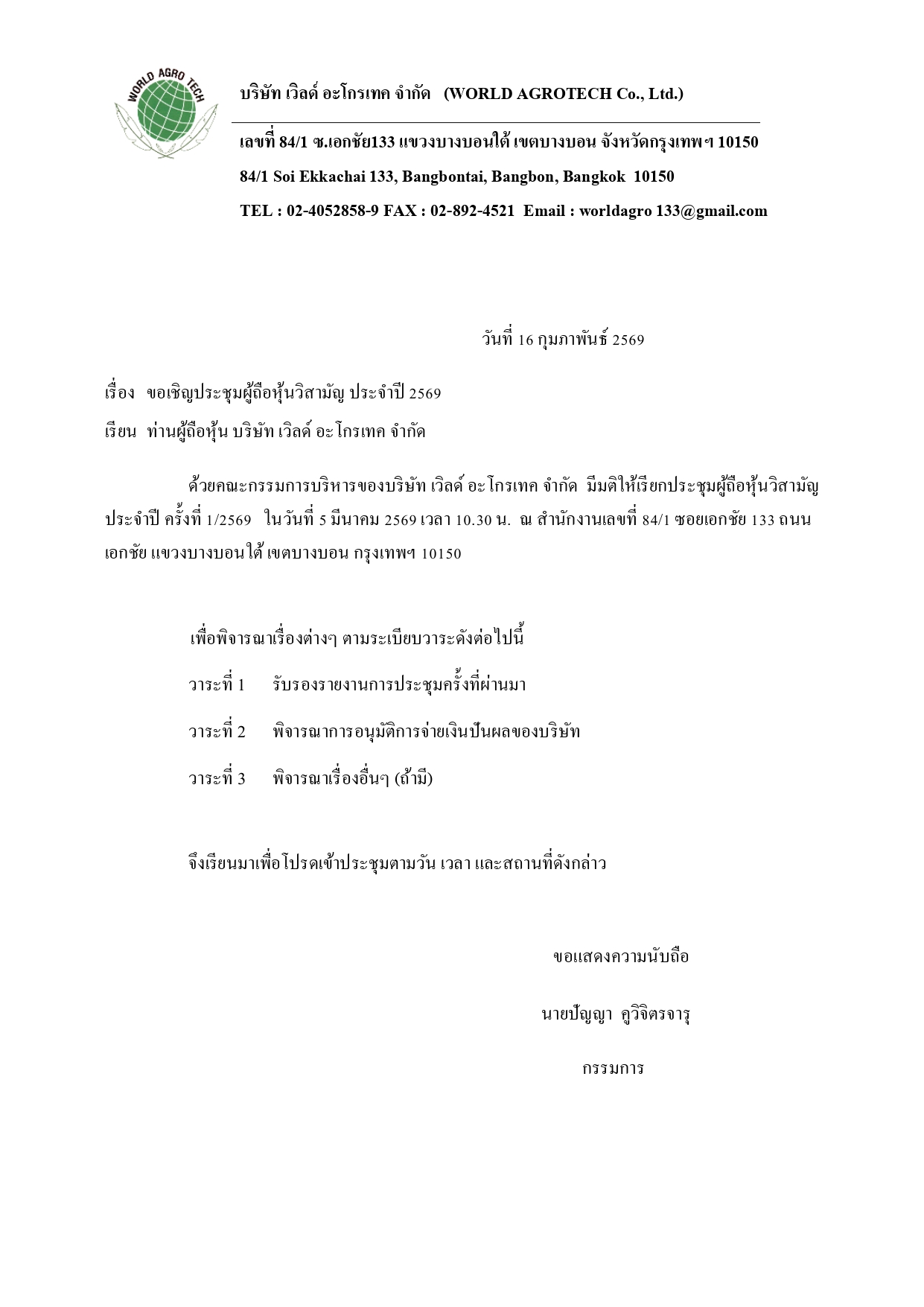 ประกาศ เรื่อง ประชุมวิสามัญ จ่ายเงินปันผล