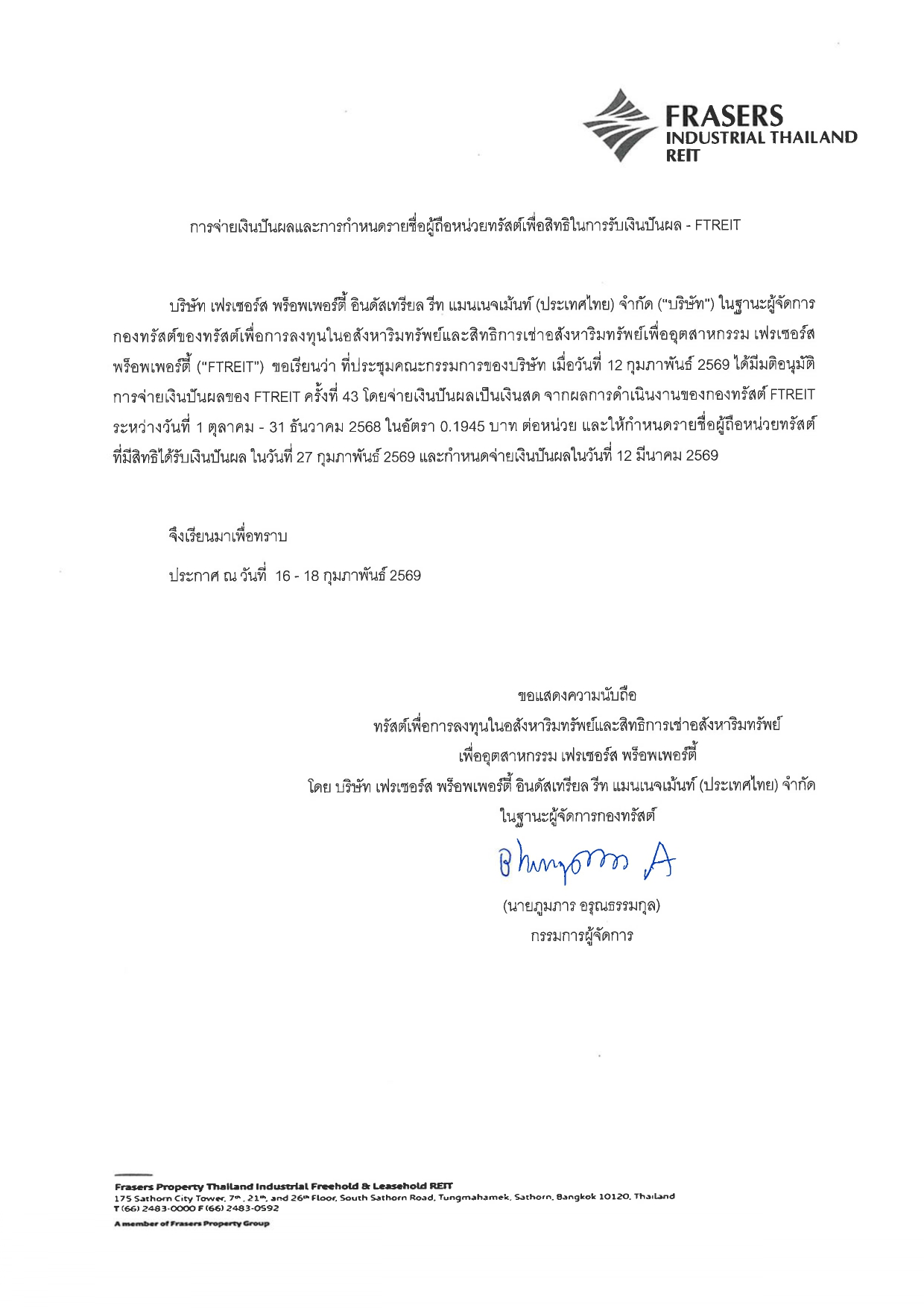 ประกาศ เรื่อง ประกาศจ่ายเงินปันผล