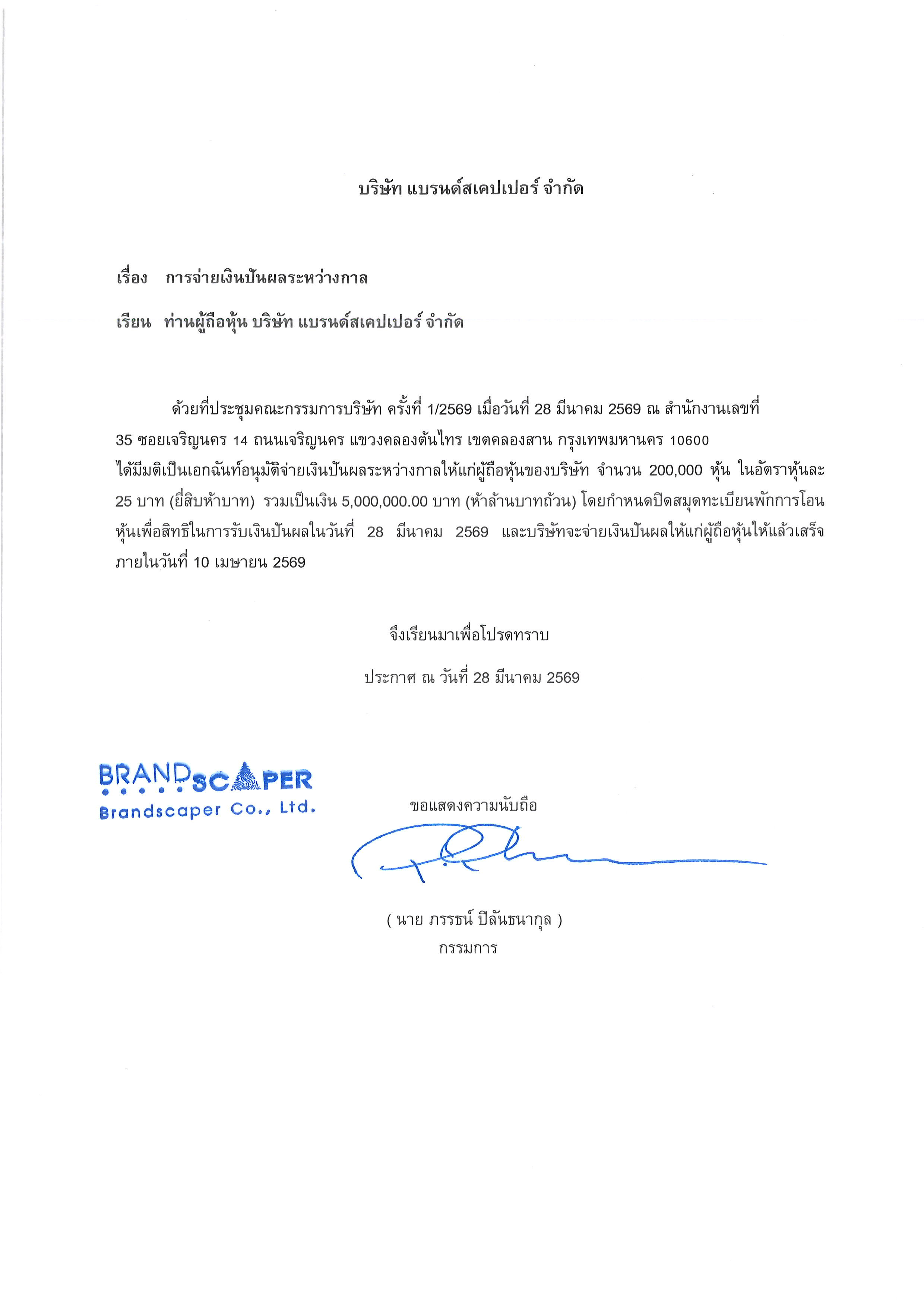 ประกาศ เรื่อง ประกาศจ่ายเงินปันผล