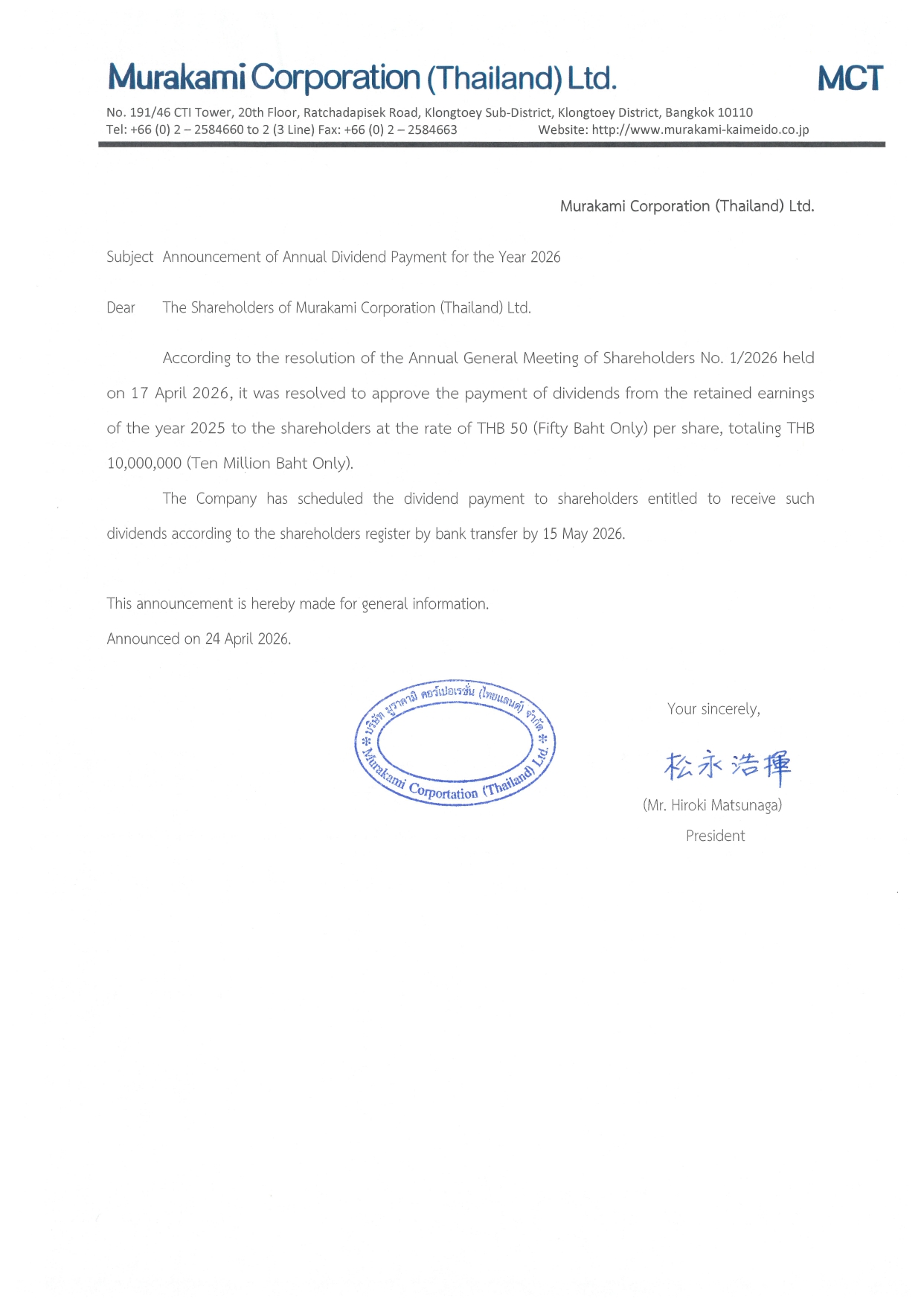 ประกาศ เรื่อง ประกาศจ่ายเงินปันผล