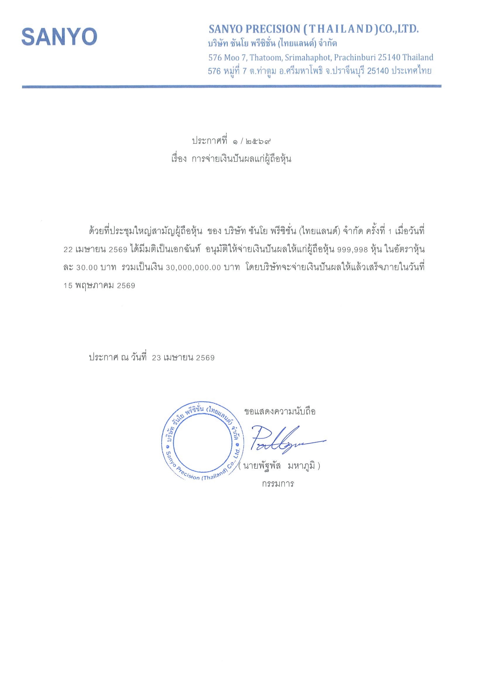 ประกาศ เรื่อง ประกาศจ่ายเงินปันผล